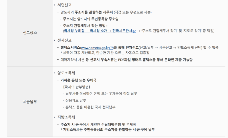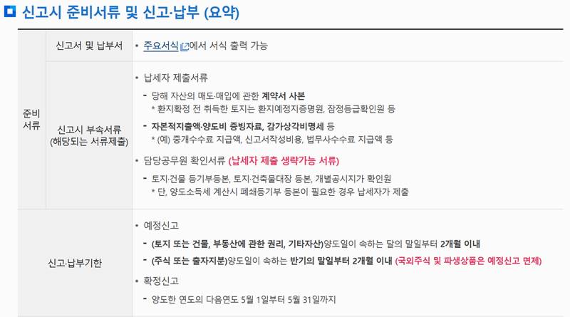 4. 신고할 때는 매매계약서 사본, 양도비용 증빙자료를 준비하고, 토지나 건물 등기부등본은 담당공무원이 확인하는 경우도 있어 납세자가 제출을 생략할 수 있습니다. 신고는 홈택스에서 전자신고하거나 주소지 관할 세무서로 서면신고하면 됩니다.