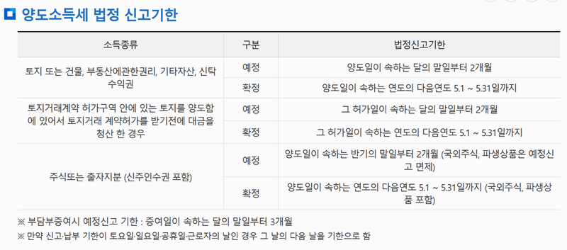 3. 양도소득세 신고는 예정신고와 확정신고로 나뉘며, 토지나 건물 같은 자산은 양도일이 속한 달의 말일부터 2개월 이내에 예정신고를 해야 합니다. 확정신고는 해당 연도의 다음해 5월 1일부터 5월 31일까지 진행됩니다. 신고 기한이 공휴일인 경우 그 다음 날로 자동 연장됩니다.