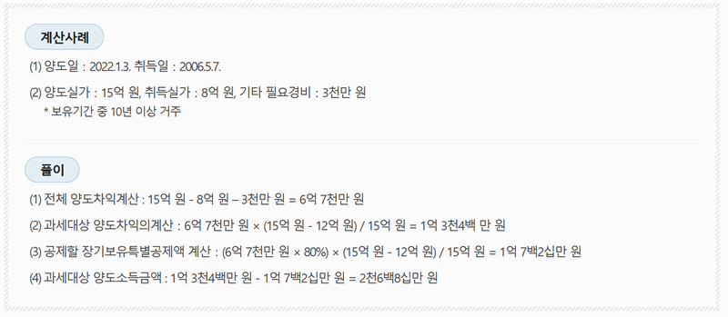 2. 예를 들어, 2006년에 8억 원에 산 집을 2022년에 15억 원에 팔았다면 양도차익은 6억 7천만 원이 됩니다. 이때 12억 원 초과분에 해당하는 양도차익만 세금 대상이 되고, 장기보유특별공제를 적용하면 최종 세금은 2천6백8십만 원으로 줄어듭니다.