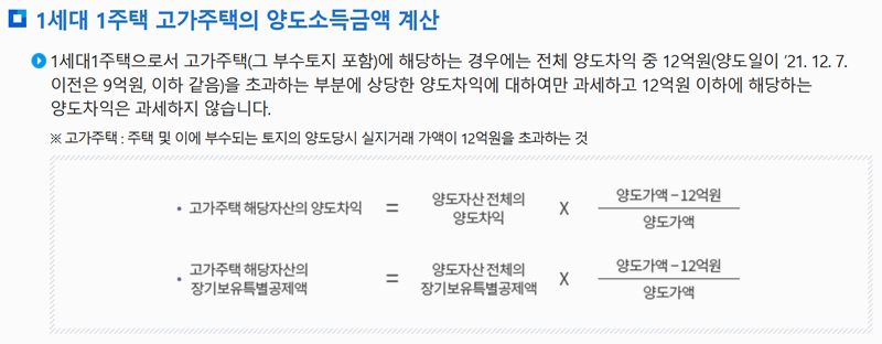 1. 1세대 1주택 고가주택에 해당하는 경우 양도차익 중 12억 원을 초과하는 금액에만 세금이 부과됩니다. 12억 원 이하 부분은 과세하지 않기 때문에 주택 가격에 따라 세금 부담이 달라집니다. 2021년 12월 7일 이전에는 9억 원 기준이었지만 이후 12억 원으로 조정되었습니다.