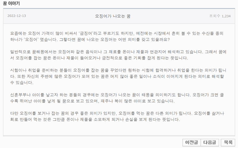 5. 궁금한 꿈 내용을 확인해보면 어떤 의미인지 정리돼 있고 조회수까지 나와 있어요. 보고 나서 목록으로 돌아가거나 다른 해몽도 이어서 살펴볼 수 있어서 이용하기 편해요.