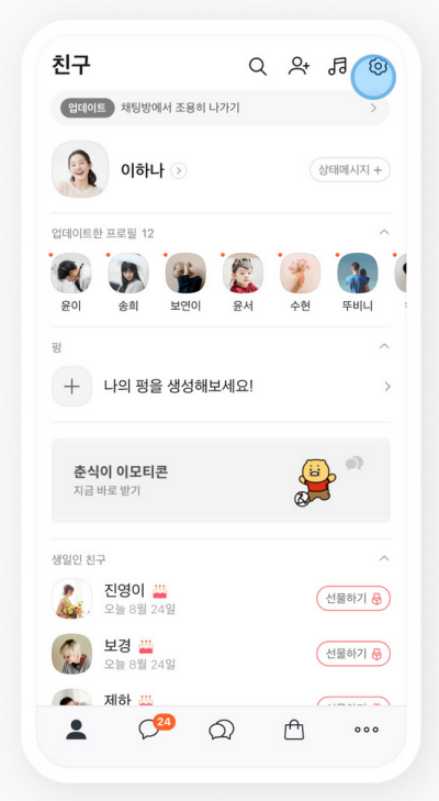 5. 연락처 허용을 설정하려면 카카오톡 메인화면에서 오른쪽 위에 있는 점 세 개 아이콘을 눌러 설정으로 들어갑니다. 거기서 전체설정 메뉴로 이동해주면 추가적인 설정을 손볼 수 있어요.