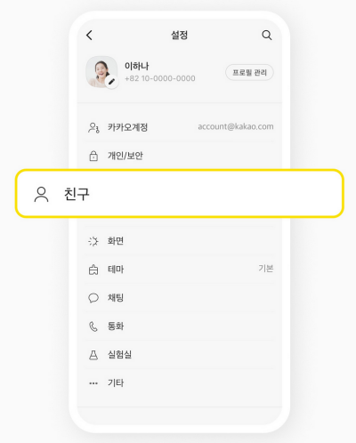 6. 전체설정 화면에 들어가면 여러 메뉴가 보이는데 친구 관련 설정을 확인하려면 친구 탭으로 들어가야 합니다. 이곳에서 친구 목록과 추가 설정들을 확인하고 조절할 수 있으니 꼭 알아두면 좋아요.
