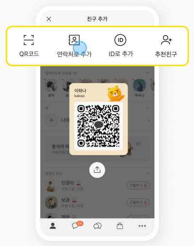 2. 친구추가 화면으로 들어가면 QR코드, 연락처, ID 입력 등 여러 방법이 나오는데 그중에서 연락처로 추가하는 방법을 선택해주시면 됩니다. 전화번호만 알고 있어도 쉽게 친구로 연결할 수 있어서 자주 활용되는 기능이에요.