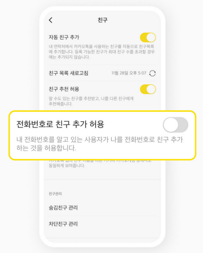 7. 마지막으로 친구 탭 안에서 전화번호로 친구 추가 허용이라는 부분을 눌러 활성화해주면 됩니다. 이렇게 설정해두면 상대방도 전화번호만으로 나를 친구로 추가할 수 있어 더욱 편리하게 사용할 수 있어요.