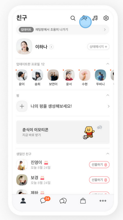 1. 첫번째로 카카오톡을 켜면 화면 상단 사람 모양에 친구추가 아이콘을 찾아 눌러주면 됩니다. 여기서 새로운 친구를 추가하는 다양한 방법으로 넘어갈 수 있어 아주 간편하게 시작할 수 있어요.