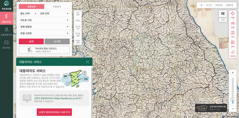 6. 좌측 메뉴에서 역사 지도를 선택하면 옛날 대동여지도로 강원도를 살펴볼 수 있습니다. 과거의 지도를 통해 현재와 비교하며 강원도의 변화를 느껴볼 수 있습니다.