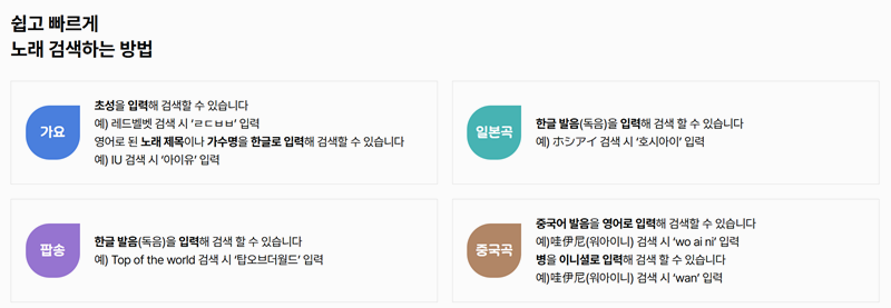 4. 가요는 초성만 입력해도 검색되기 때문에 곡 제목이 가물가물할 때 편리해요. 영어로 된 제목이나 가수 이름도 한글 발음으로 입력하면 쉽게 찾아져요. 일본, 팝송, 중국곡도 각각 발음이나 이니셜로 검색할 수 있어 접근 방식이 다양해요.