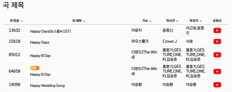 5. 검색창에는 곡 제목 외에도 번호나 가수, 작사가, 작곡가 이름을 넣어서 찾을 수 있어요. 곡에 대한 정보 중 하나만 알고 있어도 원하는 결과를 충분히 얻을 수 있어 활용도가 높습니다.