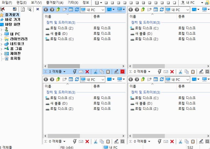 4. 설치가 끝나면 네 방향으로 분할된 화면이 나타납니다. 여러 폴더를 동시에 열어 작업할 수 있어 파일 복사나 이동이 잦은 경우 효율적으로 쓸 수 있습니다.