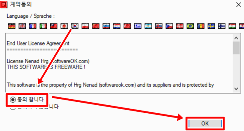 2. 받은 파일을 열면 설치를 시작할 수 있는데 먼저 언어 선택과 동의 여부를 묻는 창이 뜹니다. 여기서 태극기 아이콘을 선택한 뒤 동의 항목을 누르고 진행하면 됩니다.