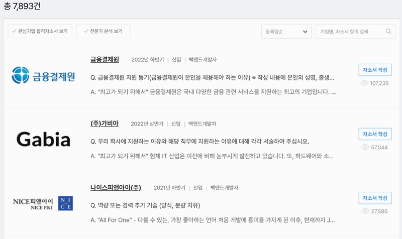 3. 결과에서는 다양한 기업의 최근 합격자소서를 열람할 수 있습니다. 여러 기업의 자소서를 참고하면서 각 회사의 특징을 파악할 수 있죠.