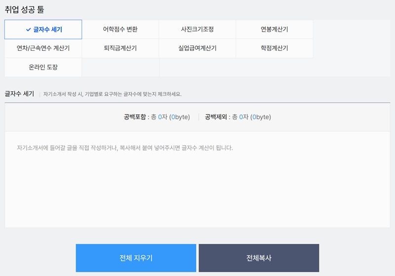 5. 왼쪽 메뉴에는 여러 취업 툴이 있습니다. 글자수 세기, 어학점수 변환, 사진 크기 조정, 연봉 계산기, 연차/근속 연수 계산기 등 다양한 툴을 활용할 수 있어요.