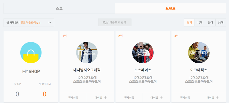 1. 인기 있는 브랜드들을 한눈에 볼 수 있게 정리돼 있어서 어떤 제품이 잘 나가는지 바로 알 수 있습니다. 브랜드 선택 후 좌측 카테고리에서 우측의 브랜드를 고른 뒤 골프·아웃도어로 이동하면 자연스럽게 원하는 항목을 찾을 수 있습니다.