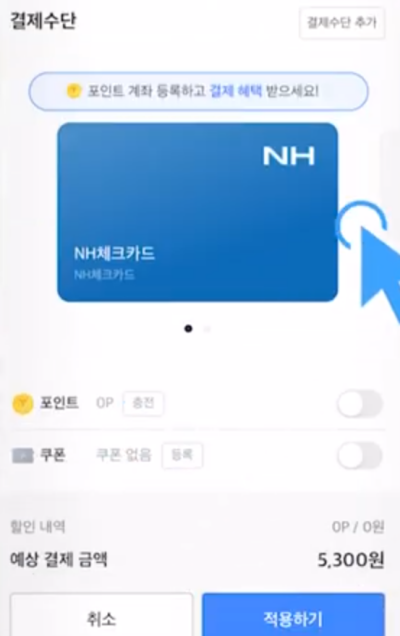 7. 결제는 카드 등록을 통해 앱 내에서 진행할 수 있습니다. 포인트나 쿠폰이 있을 경우 함께 설정해두면 더 간편하게 결제가 완료됩니다.
