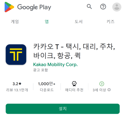 1. 카카오 T 앱은 택시를 포함해 대리, 주차, 바이크 등 다양한 이동 수단을 담고 있으며 1천만 이상이 사용하고 있는 이동 앱입니다. 설치를 눌러서 내려받으면 바로 사용할 수 있습니다.