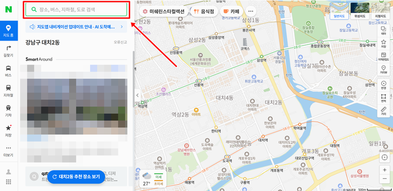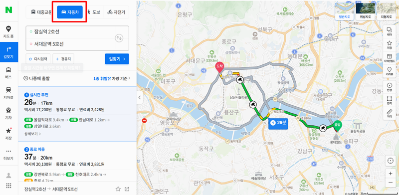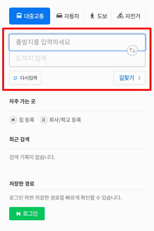1. 검색창에 출발지와 도착지를 입력하면 바로 경로가 나타납니다. 원하는 이동수단도 손쉽게 고를 수 있어 도보, 자전거, 자동차 중 내 상황에 맞게 선택하면 됩니다.