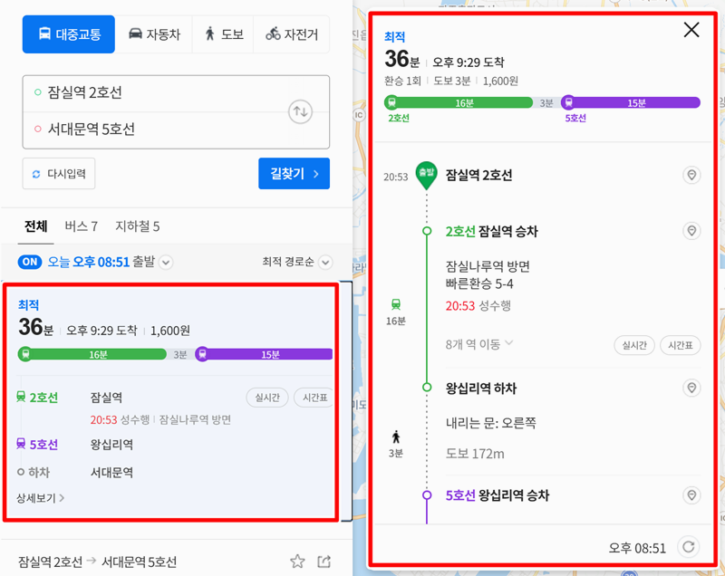 4. 대중교통을 이용할 경우 최적의 경로가 바로 표시되고 자세한 이동 경로까지 함께 확인할 수 있어 초행길에도 걱정 없이 따라가기 좋습니다.