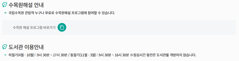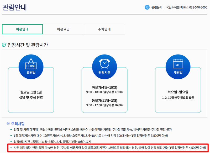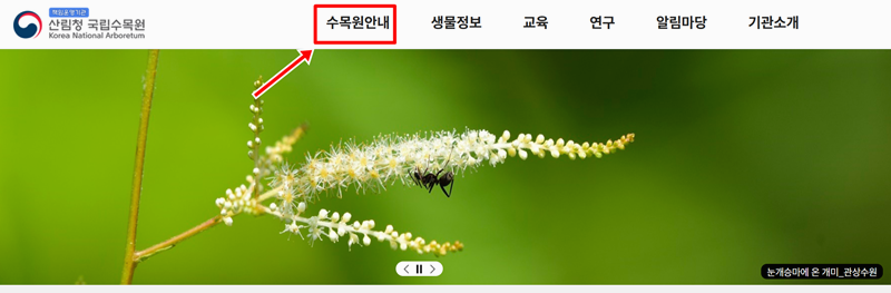 1. 국립수목원 홈페이지 상단 메뉴 중 '수목원안내' 항목을 누르면 다양한 정보로 이동할 수 있는 메뉴들이 보여집니다. 여기서 이용안내로 이동하면 관람 관련 세부 내용을 확인할 수 있습니다.