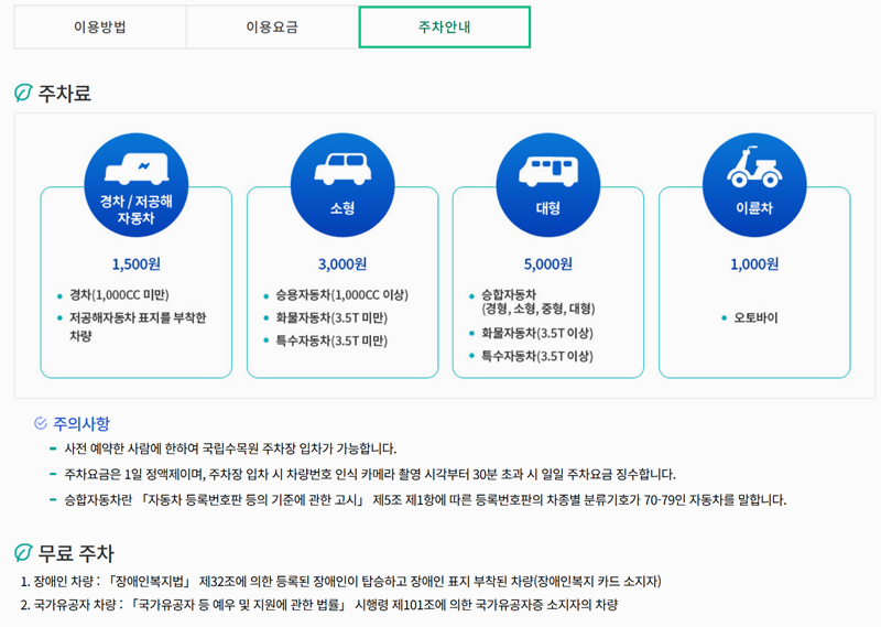 10. 주차요금은 차량에 따라 다르며 경차와 저공해 차량은 1,500원 소형차는 3,000원 대형차는 5,000원 이륜차는 1,000원입니다.