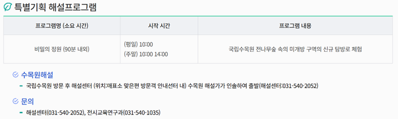 7. 해설 프로그램은 시간대별로 다양한 테마로 진행되며 해설가와 함께하는 숲 탐방, 전시원 식물 설명 등 체험형으로 구성돼 있습니다.