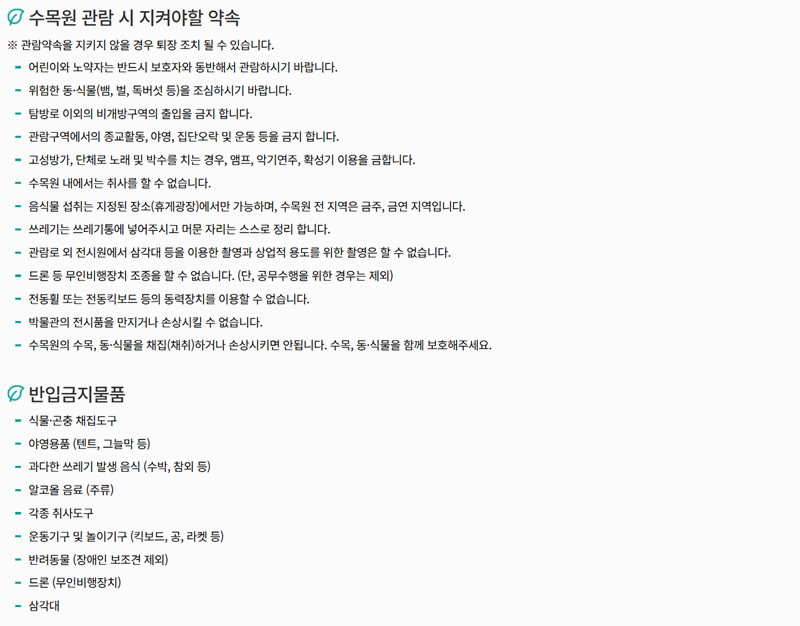 6. 관람 시에는 지정된 구역을 벗어나지 않아야 하며 동식물 채집 행위나 반입이 금지된 물품도 있으니 주의해야 합니다.