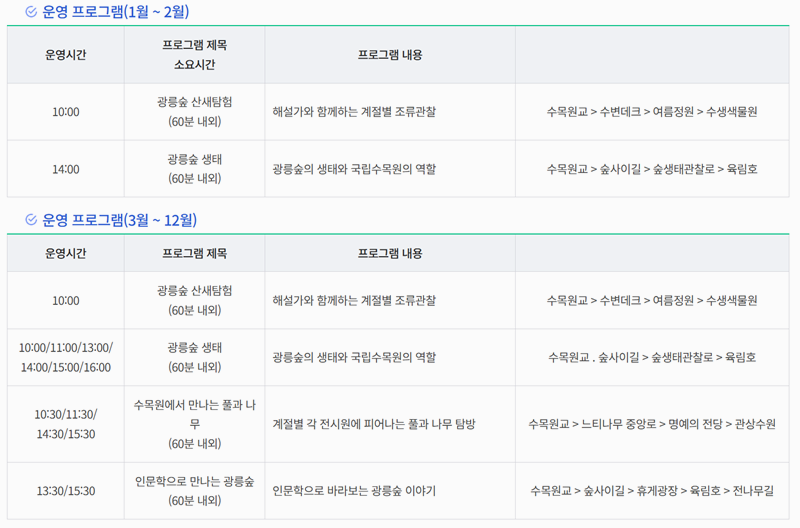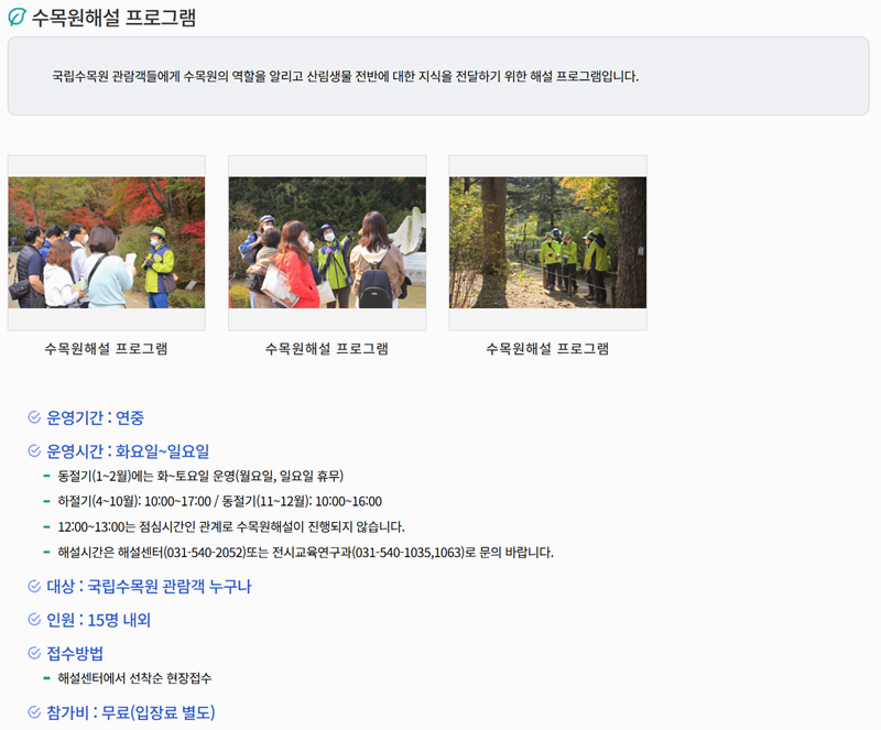 4. 누구나 참여할 수 있는 해설 프로그램이 운영 중이며 계절별로 운영 시간과 프로그램 주제가 달라 산림에 대한 이해를 돕는 데 도움이 됩니다.