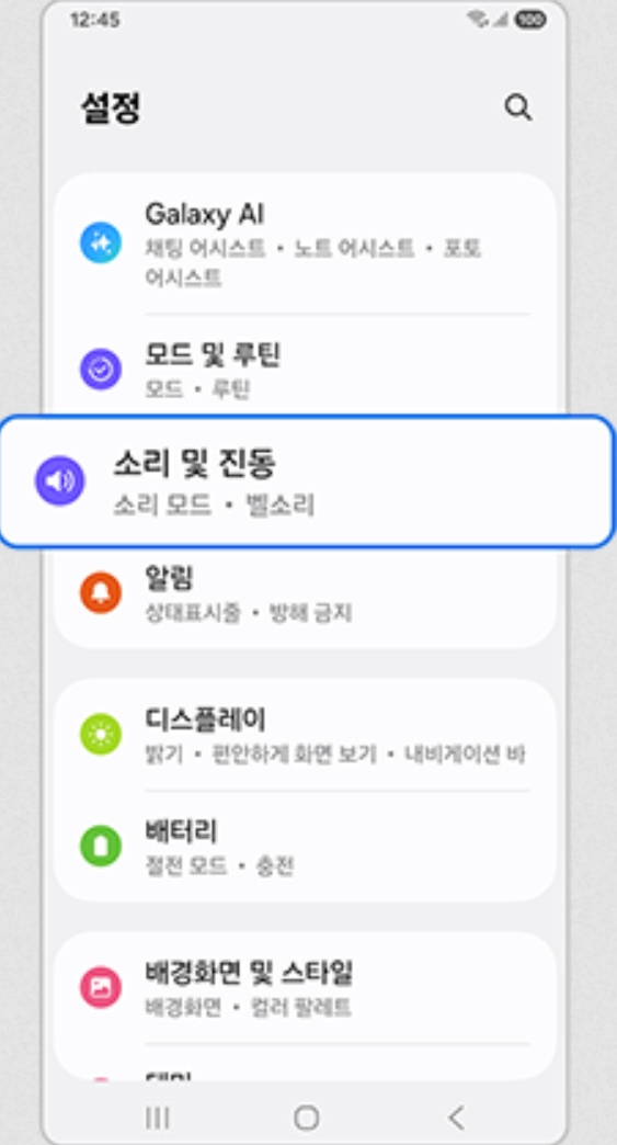 2. 설정 화면에서 여러 항목 중 '소리 및 진동'을 선택하면 소리 모드와 진동 관련 기능을 확인하고 조정할 수 있어요.