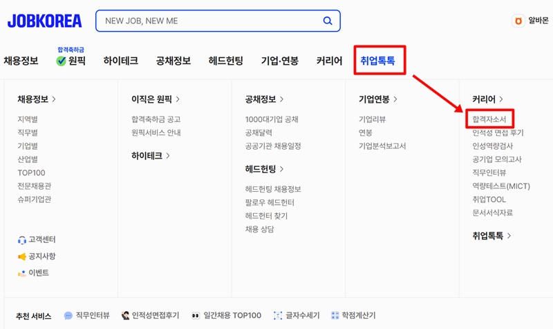 1. 다양한 채용 정보와 함께 자기소개서 예시, 면접 정보 등을 제공합니다. 구직자가 원하는 직무와 관련된 자료를 쉽게 찾아볼 수 있어 취업 준비에 큰 도움이 됩니다. 상단 메뉴에서 취업톡톡 메뉴를 보면 합격자소서 항목이 있는데 여기로 들어갑니다.
