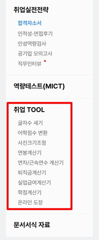 5. 왼쪽 메뉴에는 여러 취업 툴이 있습니다. 글자수 세기, 어학점수 변환, 사진 크기 조정, 연봉 계산기, 연차/근속 연수 계산기 등 다양한 툴을 활용할 수 있어요.