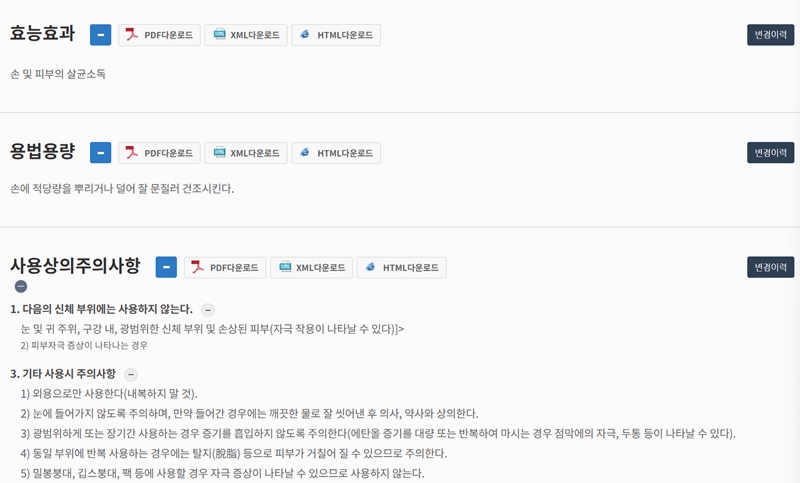 7. 효능효과, 용법용량, 사용 주의사항 등을 PDF, XML, HTML 형식으로 다운로드할 수 있어 필요한 정보를 문서로 저장해서 언제든지 참고할 수 있습니다. 이렇게 다양한 형식으로 있어 유용합니다.