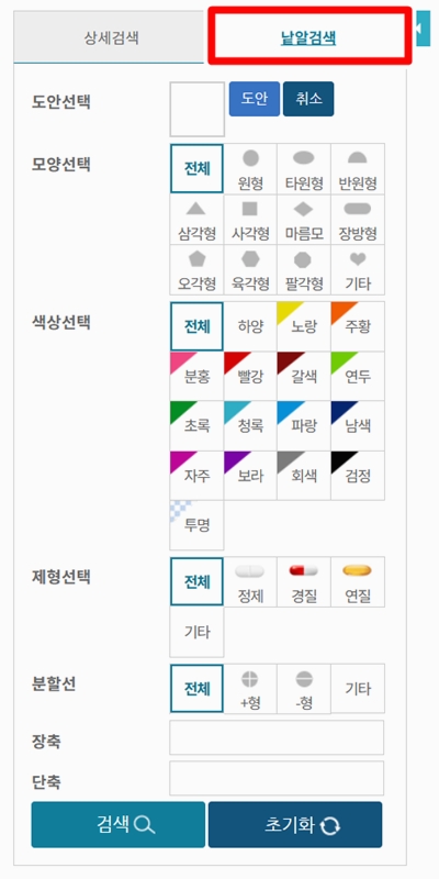 3. 알약 검색은 두 가지 방법으로 할 수 있습니다. 첫 번째는 제품명, 성분 등을 입력해 검색하는 상세검색이고 두 번째는 알약의 도안, 모양, 색상 등을 선택해 검색하는 낱알검색입니다. 원하는 방식으로 빠르게 검색할 수 있어요.