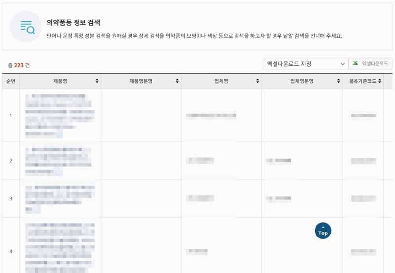 4. 검색 후에는 우측에서 제품명, 제품영문명, 회사명, 회사영문명, 품목기준코드 등을 확인할 수 있습니다. 이 정보들은 약에 대한 자세한 내용을 파악하는 데 유용합니다.