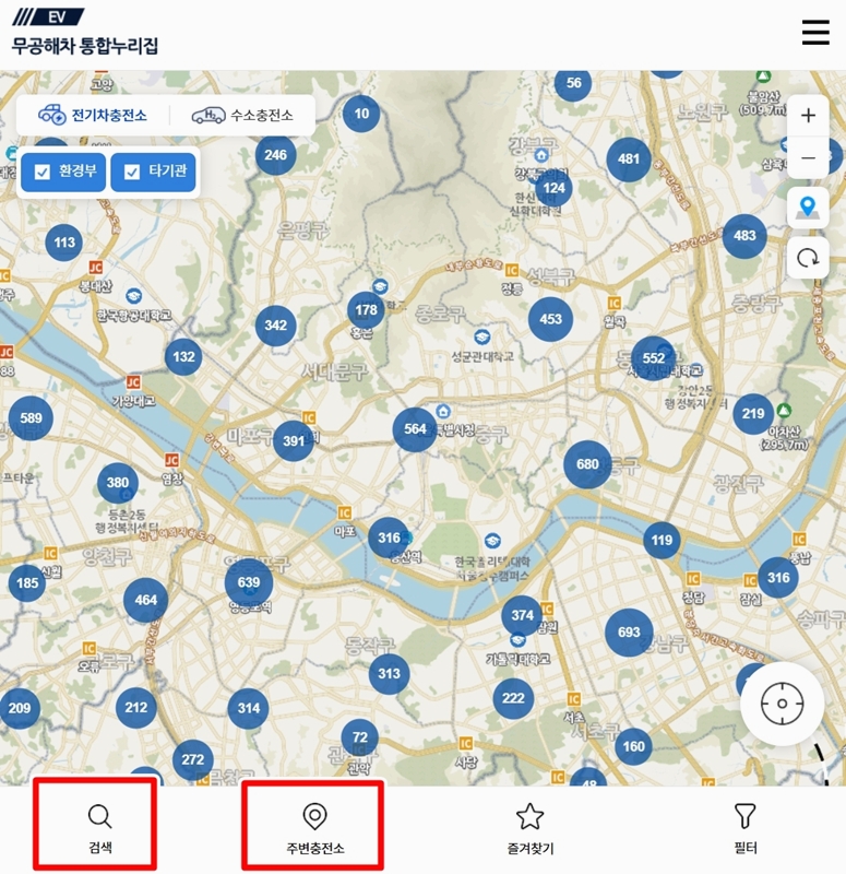 3. 지도 화면에서는 전국 충전소 위치가 숫자 아이콘으로 표시돼요. 하단에 '검색'과 '주변충전소' 메뉴가 있어서 직접 위치를 입력하거나 현재 위치 중심으로 찾을 수 있어요.