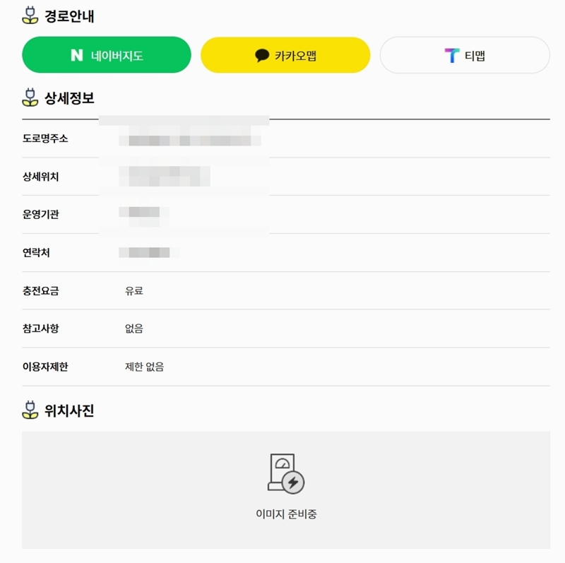 7. 마지막으로 충전소 상세 위치, 운영기관, 연락처, 요금, 참고사항 같은 정보가 나와요. 지도 앱 연동 기능도 함께 있어 길찾기도 바로 할 수 있어요.