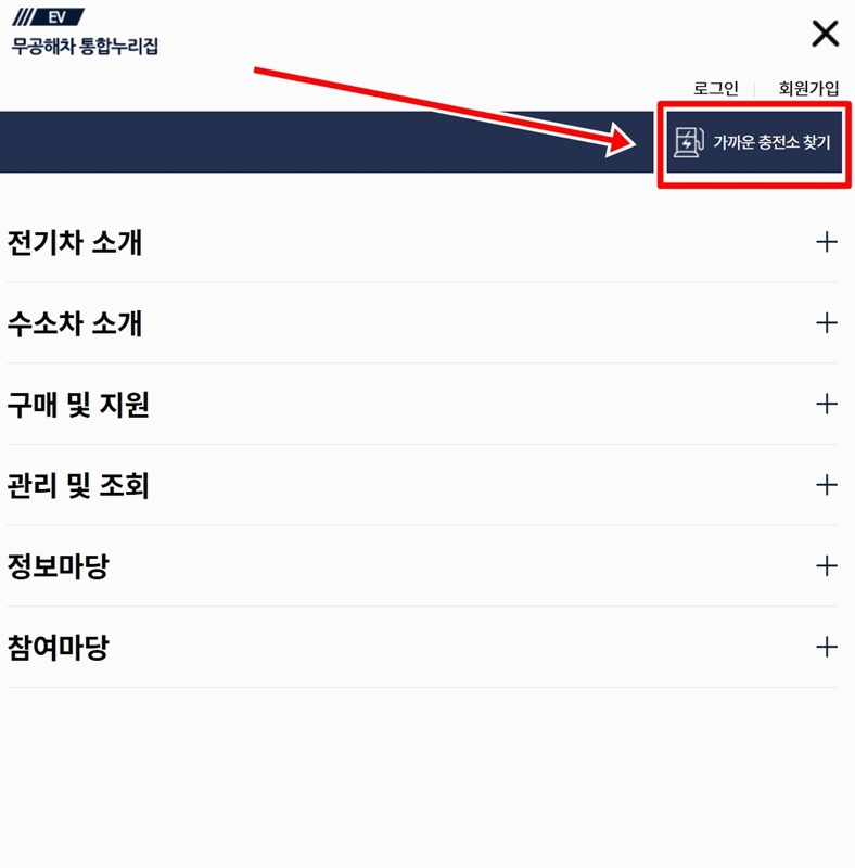 2. 펼쳐진 메뉴 중 '가까운 충전소 찾기' 항목을 선택하면 지도 기반의 검색 페이지로 바로 이동돼요. 원하는 지역의 충전소를 쉽게 찾는 데 도움을 줘요.
