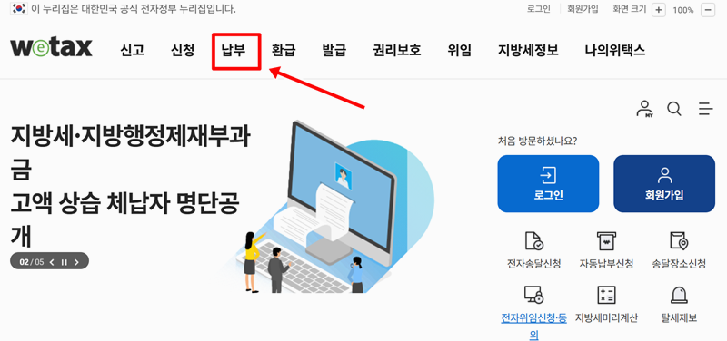 1. 위택스에 접속하면 상단에 다양한 메뉴가 보이는데요, 이 중에서 '납부' 항목에 마우스를 올리면 관련 메뉴들이 자동으로 펼쳐집니다. 화면 구성도 깔끔해서 찾기 어렵지 않아요.