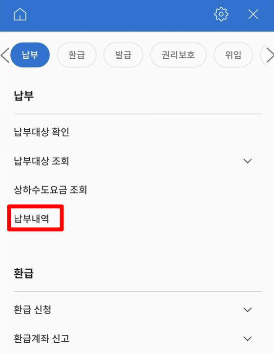2. 펼쳐진 메뉴에서 여러 항목 중 '지방세 납부내역'이라는 문구를 찾으면 됩니다. 한눈에 알아볼 수 있도록 정리돼 있어 어렵지 않게 눌러볼 수 있어요.