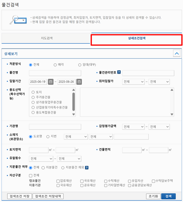 3. 상세조건 검색에서는 처리방식, 물건명, 입찰기간, 위치 등 다양한 조건을 입력해 원하는 물건을 좁혀서 찾을 수 있습니다. 조건을 입력하고 아래 검색을 누르면 결과가 나옵니다.