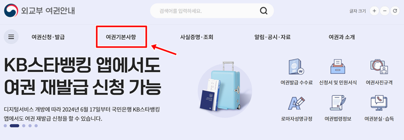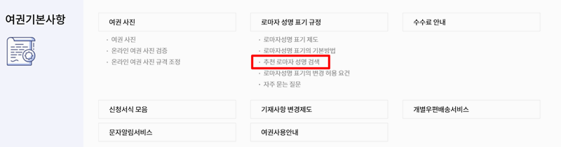 2. 여권기본사항 페이지에서는 여권 사진, 수수료, 성명 표기법 등 다양한 항목이 나열돼 있고, 그중에서 추천 로마자 성명 검색을 선택해 들어가면 이름 표기를 확인할 수 있어요.
