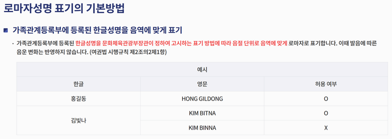 5. 성명을 변환할 때는 등록된 한글 이름을 기준으로 하고, 음절 단위로 표기하는 방식이 적용됩니다. 표기 예시를 보면 KIM BITNA는 허용되지만 KIM BINNA는 허용되지 않는다고 나와 있어요.