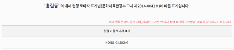 4. 입력한 이름에 대한 표기 결과가 바로 아래에 나옵니다. 예를 들어 ‘홍길동’이라는 이름은 HONG GILDONG으로 변환된 걸 확인할 수 있어요.