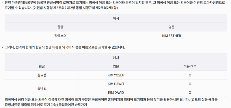 6. 외국어 이름이 한글 이름으로 등록된 경우 음역이 같다면 여권 성명으로 쓸 수 있어요. 예시로 김에스터는 KIM ESTHER로 표기하는 게 가능해요. 하지만 성경식 이름처럼 번역된 이름은 그대로 표기할 수 없어요. 김다윗의 경우 KIM DAVID는 불가하고, 발음을 살린 KIM DAWIT만 허용된다고 안내돼요.