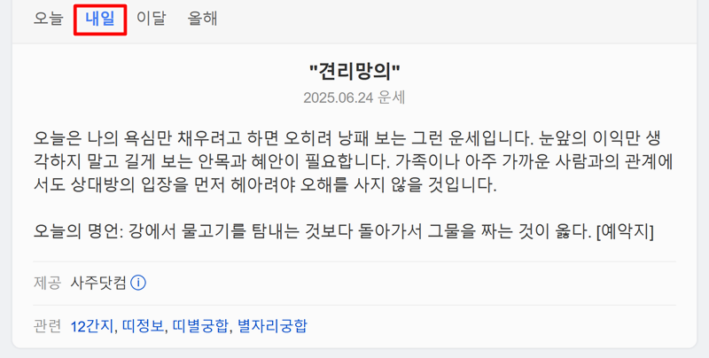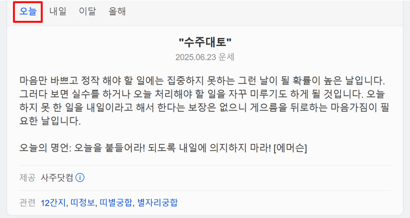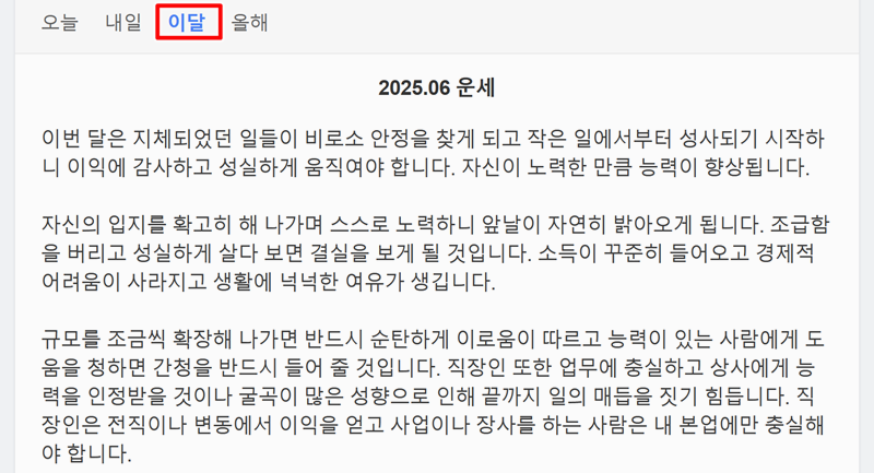 2. 오늘, 내일, 이번 달의 흐름을 간단히 살펴볼 수 있어요. 일상 속 작은 힌트를 얻기에 충분한 내용들이 담겨 있습니다.