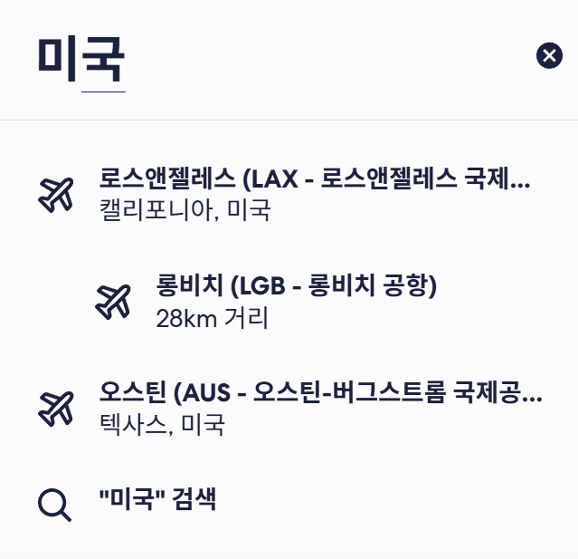 2. 출발지를 선택 한 후 목적지를 입력하면 관련된 미국 내 주요 공항들이 자동으로 추천되며, 도시 이름만 입력해도 다양한 공항 목록이 표시됩니다.
