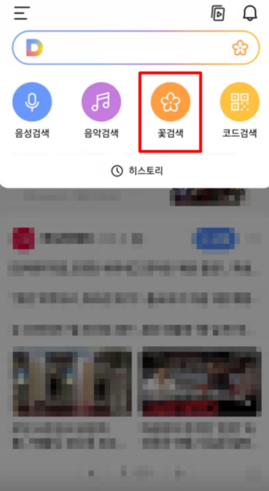 1. 다음 앱을 켜고 상단 검색창 오른쪽에 있는 아이콘을 누르면 꽃을 찾을 수 있는 기능으로 바로 들어갈 수 있게 되어 있어요.