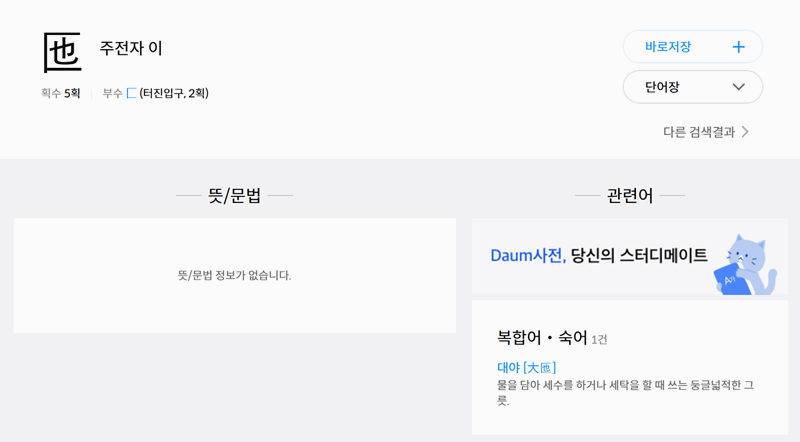 모양만 봐도 낯선 한자를 음과 뜻, 획수까지 바로 찾아볼 수 있게 도와주는 기능이에요. 옥편 한자찾기는 다음 한자사전 홈페이지에서 이용 가능 합니다.