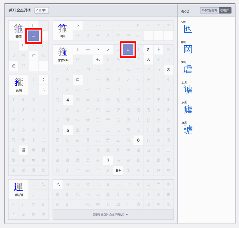 5. 조합된 여러 요소 중 원하는 모양의 부수를 하나 더 선택하면 결과가 더 정제되어 나타나고 오른쪽에 해당되는 한자들이 리스트로 나옵니다.
