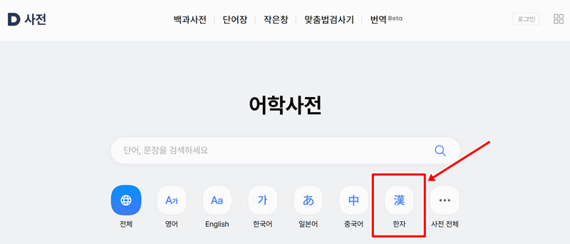 1. 처음 화면에서 단어 입력창 아래에 있는 여러 언어 중 '한자' 항목을 선택해 한자사전으로 들어갑니다.