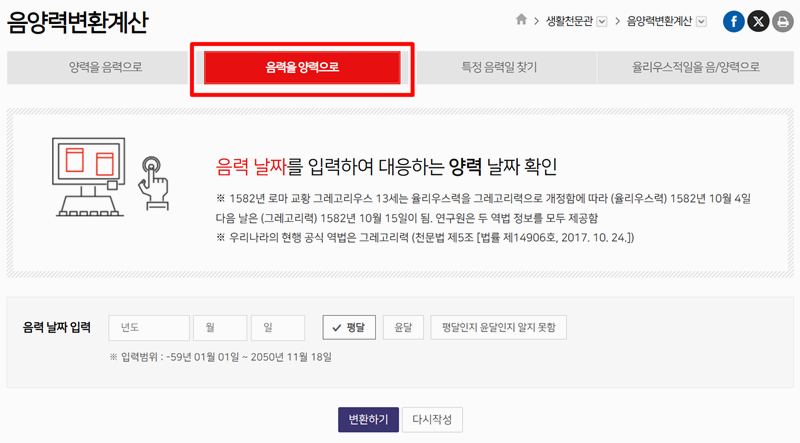 4. 반대로 양력을 음력으로를 선택하시고 양력 날짜를 입력하면 그에 해당하는 음력 날짜가 바로 나오는 구조예요. 날짜는 직접 입력하거나 달력을 통해 선택할 수 있어서 편하게 이용할 수 있어요.